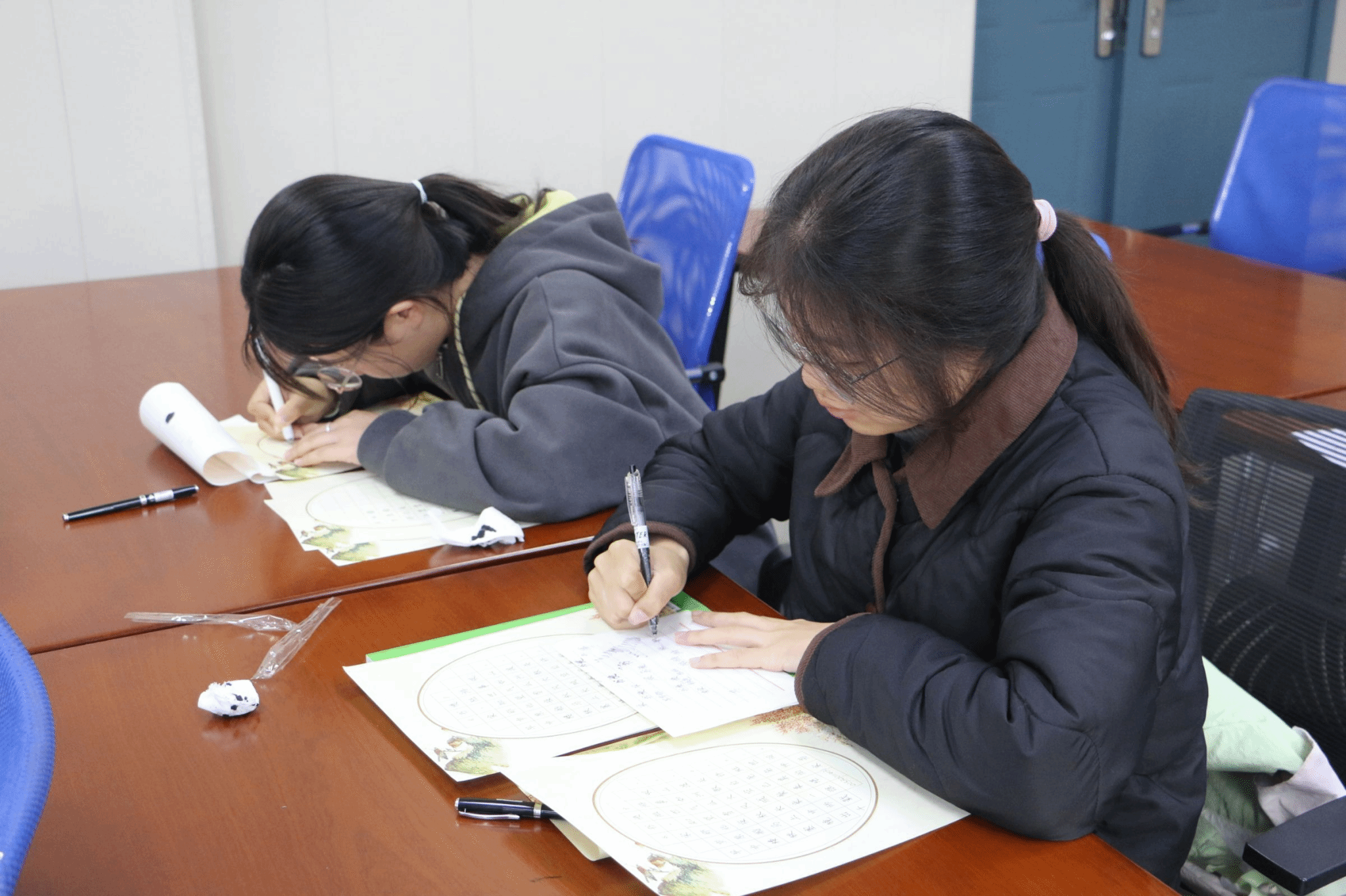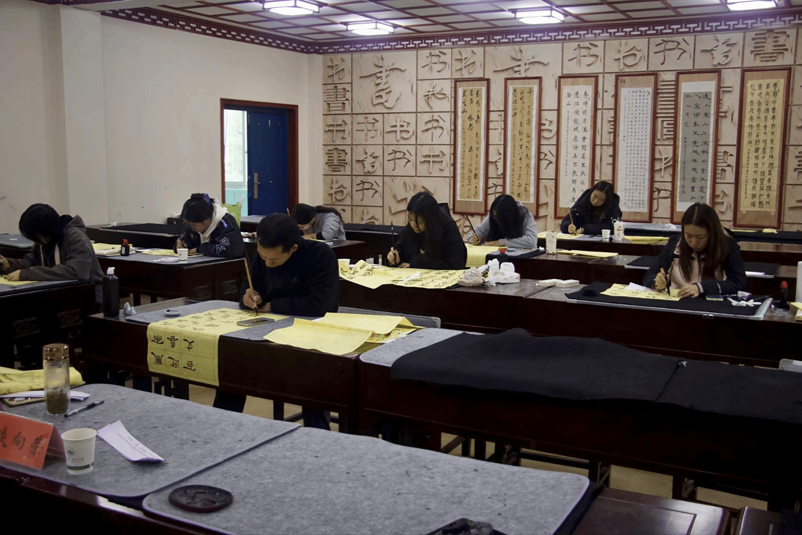 毛笔字赛场则墨香弥漫,选手们挥毫泼墨,所书作品笔画饱满、章法得体,现场可闻到明显的墨香,选手们书写时悬腕运笔,作品以经典诗词为主,字迹工整,墨色均匀,展现了基本的书法功底。有人站立挥毫,运笔洒脱;有人端坐书写,笔法精致;有人凝神聚气,一笔一画尽显功力。宣纸上,墨迹或浓或淡,线条或粗或细,结构或疏或密。选手们时而蘸墨调锋,时而观察布局,时而调整呼吸,整个赛场洋溢着浓厚的艺术氛围。通过比赛,提升了学生的书写技能,培养了学生的审美能力,增强了学生的文化自信。这些收获必将对学生的专业成长产生深远影响。