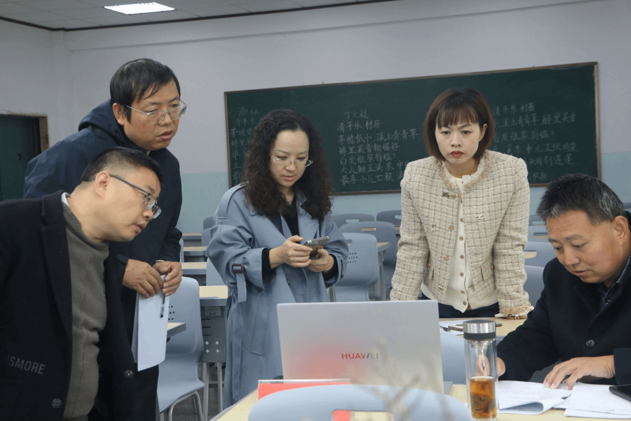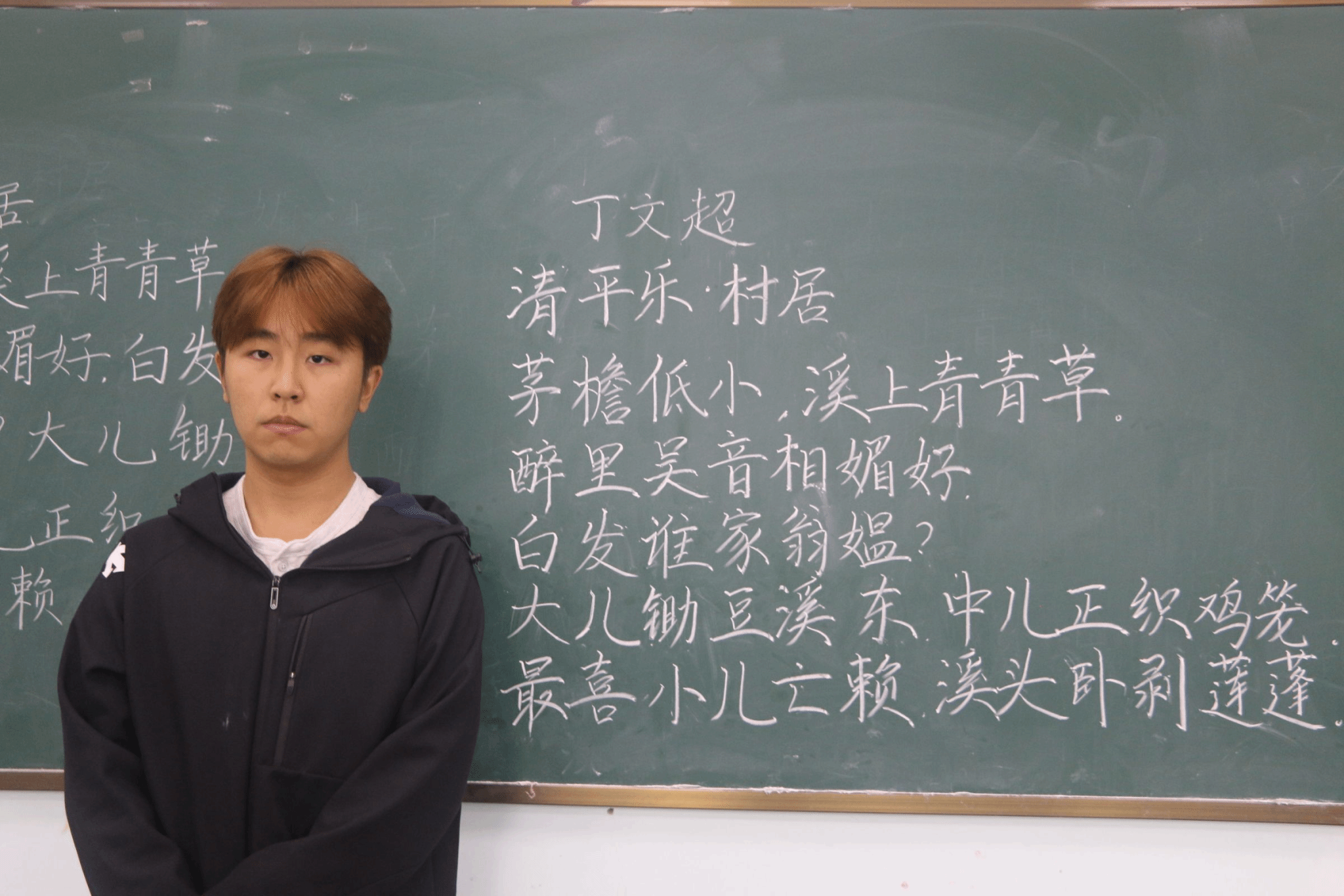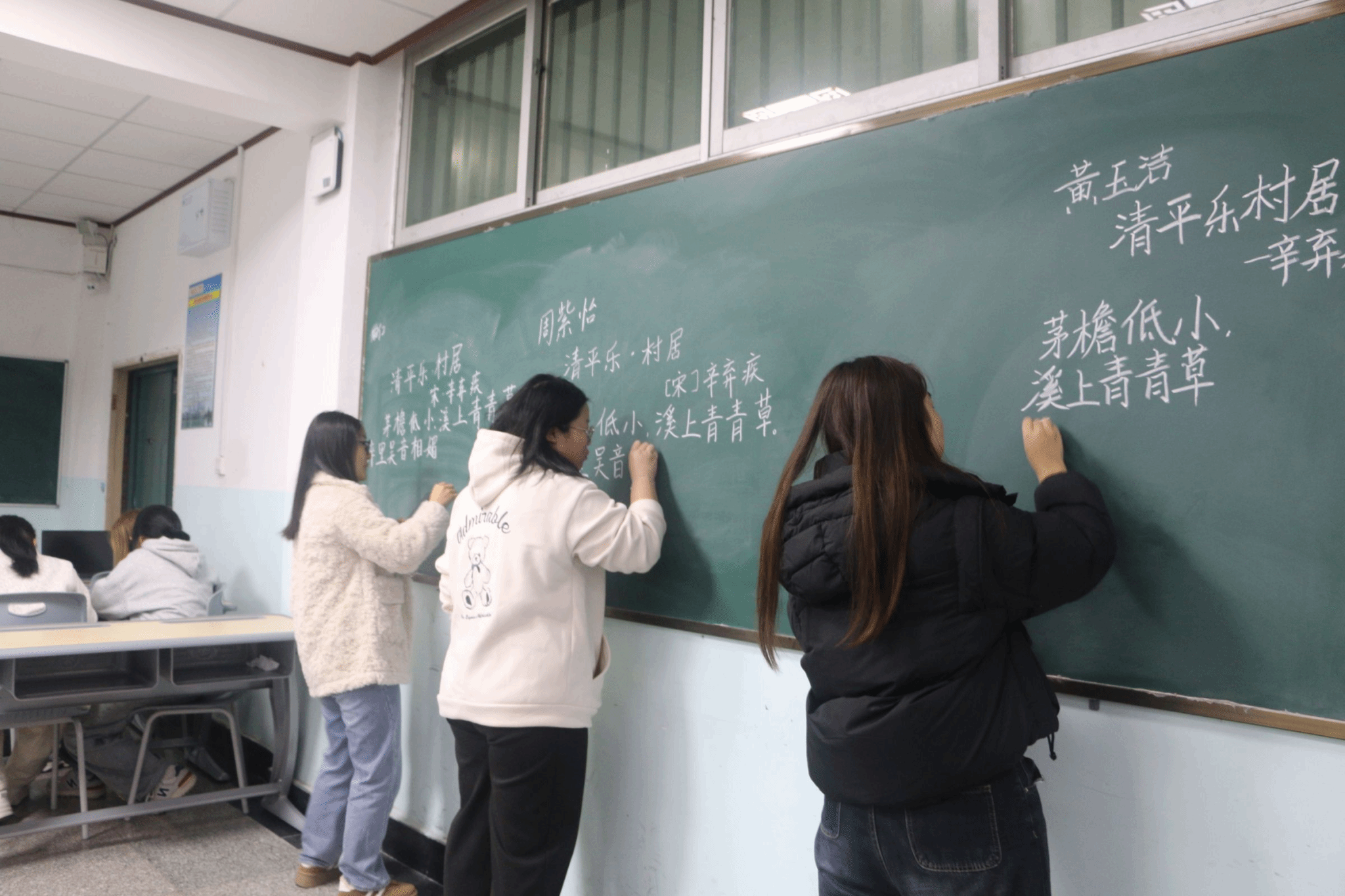 决赛现场气氛紧张而有序,现场可听到粉笔与黑板接触的规律声响,选手们书写时注重字距行距的控制,不时调整站姿以求最佳书写角度 小黑板上,古诗排版整齐,字迹干净醒目,字迹均做到了工整清晰、布局匀称。有人单手持粉笔稳健运笔,有人双指捏粉精准勾勒,有人侧身书写把控全局。粉笔与黑板摩擦的沙沙声此起彼伏,时而急促,时而舒缓。选手们或踮脚书写上部笔画,或俯身雕琢下部结构,身体随书写位置不断调整。