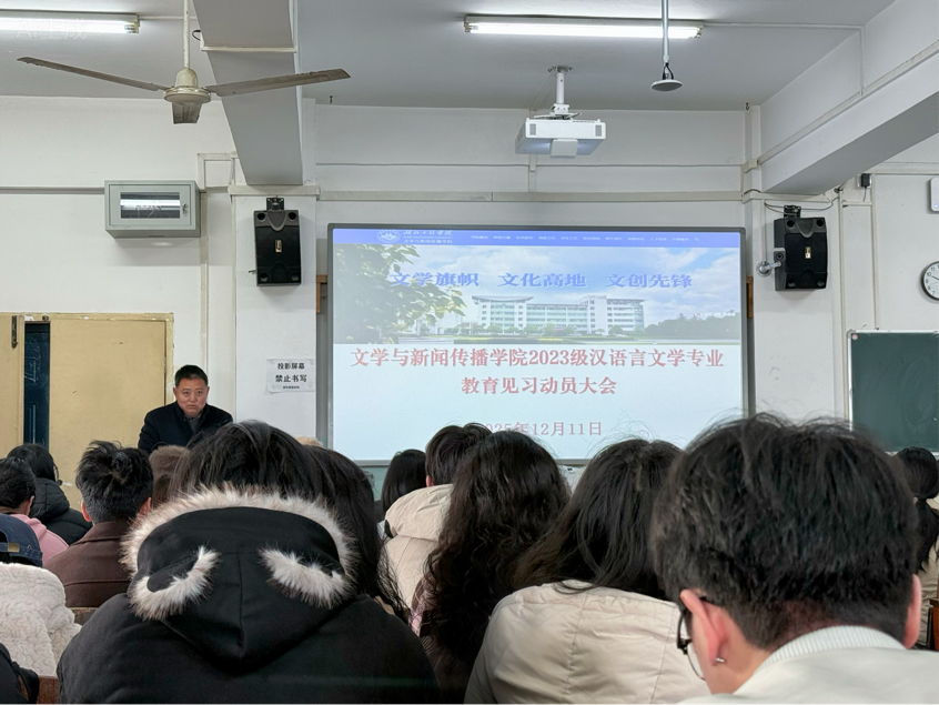 本网讯 为扎实推进教育实践教学工作,引导学生做好见习前的准备,文学与新闻传播学院(以下简称“文学院”)于12月11日在文学楼501教室召开2023级汉语言文学专业教育见习动员大会,全面部署见习相关工作。
